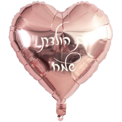 בלון הליום לב רוז גולד עם הכיתוב יום הולדת שמח בלבן