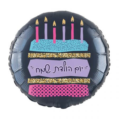בלון הליום עגול עם איור של עוגת יום הולדת עם הכיתוב: יום הולדת שמח. גודל: 45 ס”מ לא מגיע מנופח