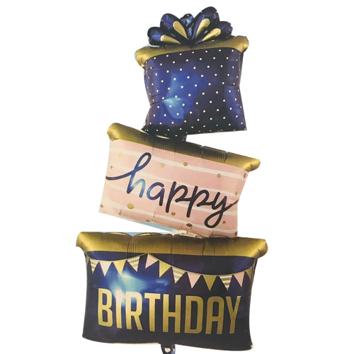 בלון הליום בצורת עוגת יומולדת בצבעי כחול זהב עם כיתוב happy BIRTHDAY