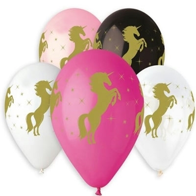 5 בלוני לטקס במגוון צבעים עם הדפס חד קרן זהב