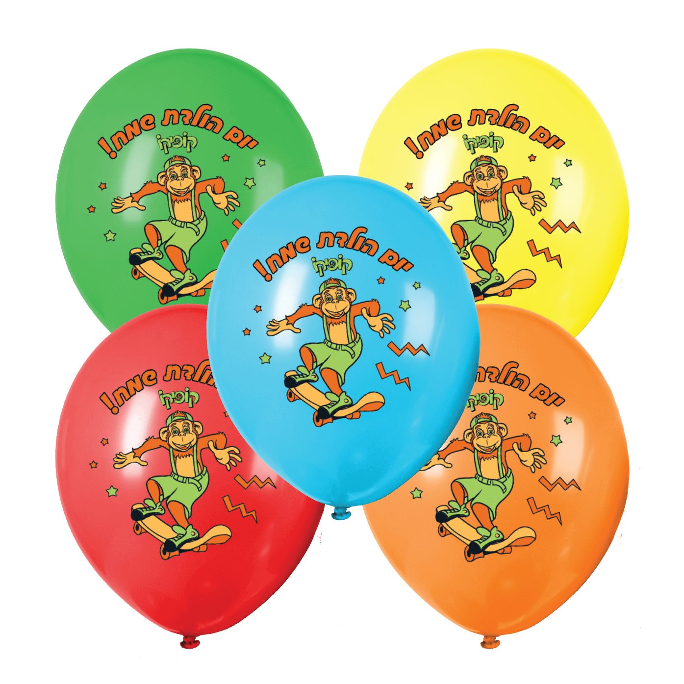 מארז של 5 בלוני לטקס ציבעוניים עם הדפס של הדמות קופיקו, והכיתוב : יום הולדת שמח