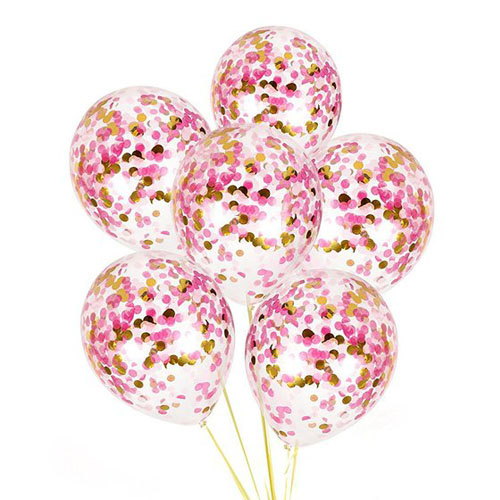 בלונים שקופים במילוי קונפטי ורוד זהב מבריק במראה יוקרתי ושמח.