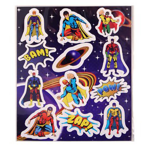 דף מדבקות בקונספט גיבורי על, מושלם כהפתעה במסיבת יום הולדת גודל הדף: 10×11.5 ס”מ 12 מדבקות בדף