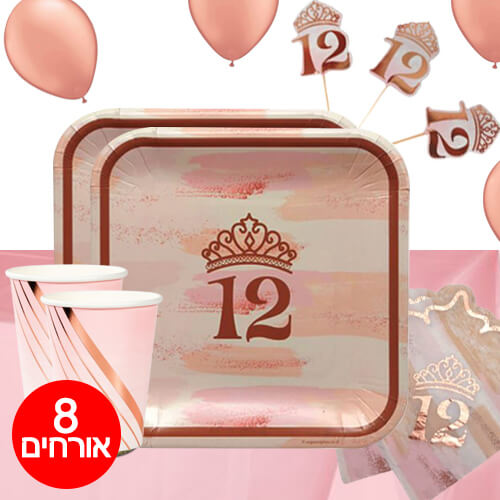 חבילת בת מצווה רוז גולד 8 מוזמנים השייכת למסיבת יום הולדת גיל 12 כתר רוז גולד,