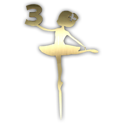 טופר לעוגה ולקישוט שולחן בצבע זהב מראה בקונספט בלרינה גיל שלוש גודל: 17×12 ס”מ