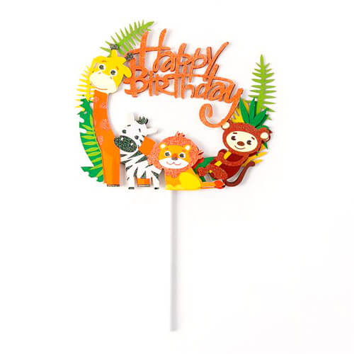 טופר ספארי צבעוני לקישוט העוגה בכיתוב Happy Birthday, מושלם לכל מסיבת חיות ויער מושקעת. גודל: 22X14 ס”מ