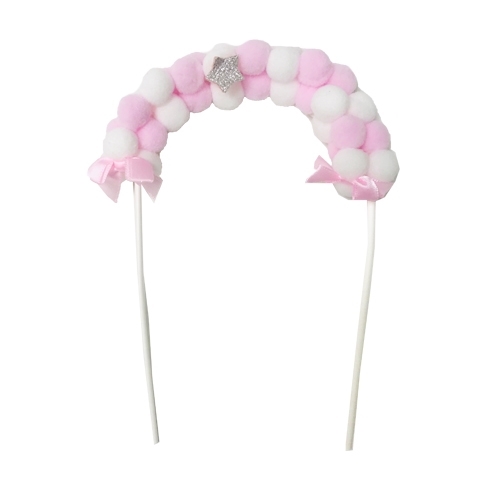 טופר לעוגה וקישוט בצורת קשת פונפונים בצבעי ורוד ולבן גודל הטופר: 18×13 ס”מ