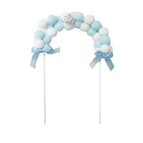 טופר לעוגה וקישוט בצורת קשת פונפונים בצבעי תכלת ולבן גודל הטופר: 18×13 ס”מ