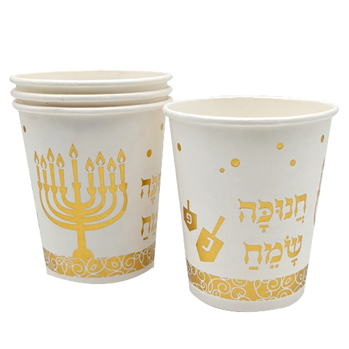 10 כוסות בעיטור מיוחד לכבוד חנוכה בצבעים לבן וזהב תכולה: 200 מ”ל