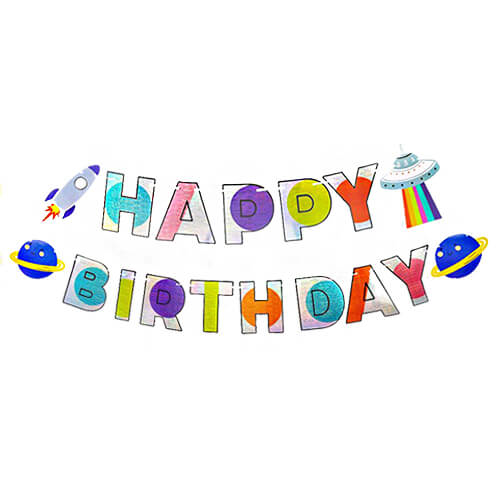 כרזה ארוכה לתלייה בקונספט חלל, עם הכיתוב Happy birthday אורך: 3 מטר