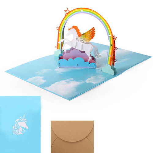 כרטיס ברכה יוקרתי נפתח עם חד קרן קשת בענן גודל הכרטיס: 15×20 ס”מ