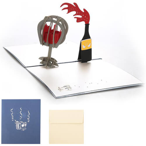 כרטיס ברכה יוקרתי נפתח עם בקבוק יין וגביע עומדים גודל הכרטיס: 13×15 ס”מ