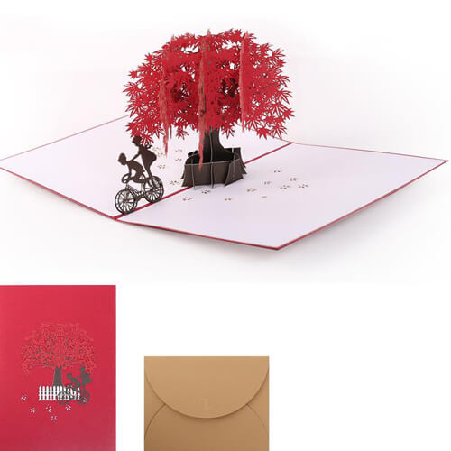 כרטיס ברכה יוקרתי נפתח עם עץ בגווני אדום וילדים משחקים גודל הכרטיס: 15×20 ס”מ
