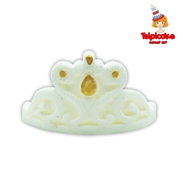 כתר נסיכה בצבע לבן עם עיטורים זהב מצבק סוכר לקישוט עוגה גודל הכתר: 8×5 ס”מ