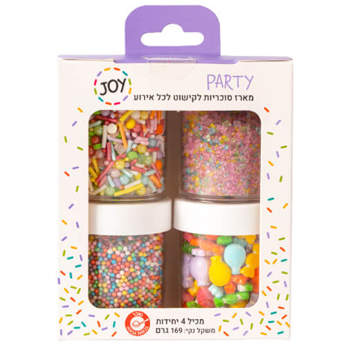 מארז סוכריות לקישוט בקונספא חגיגה המארז כולל: 4 קופסאות סוכריות מגוונות לקישוט עוגות ודברי מאפה. משקל המארז: 161 גרם.