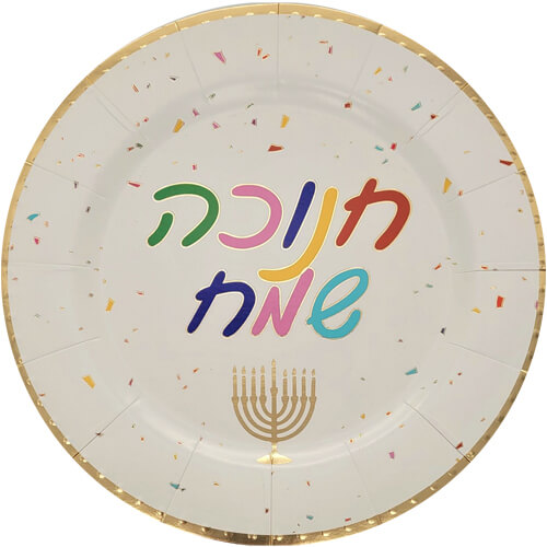 3 מגשים עגולים גדולים עם כיתוב חנוכה שמח צבעוני ועיטורי זהב