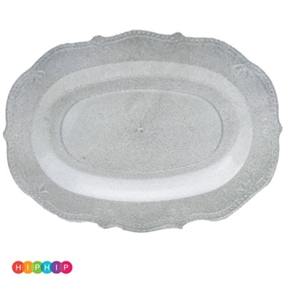 מגש אובלי כסף נצנץ חד פעמי ורב פעמי איכותי מפלסטיק בקונספט וינטג’ פרימיום גדול המגש:32×23 ס”מ 3 מגשים בחבילה