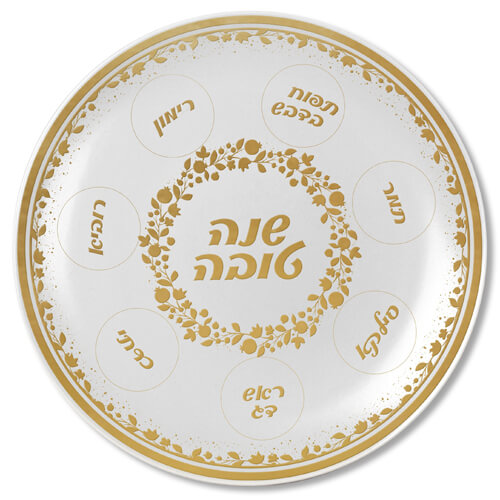 מגש ברכות לראש השנה בצבע לבן וברכות מאוירות בצבע זהב, מושלם לשולחן ראש השנה.