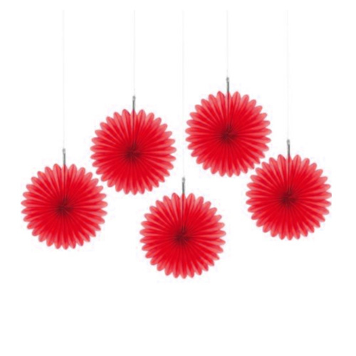 חמישה קישוטי מניפה אדומים ויפים לפיזור ותלייה ברחבת המסיבה.