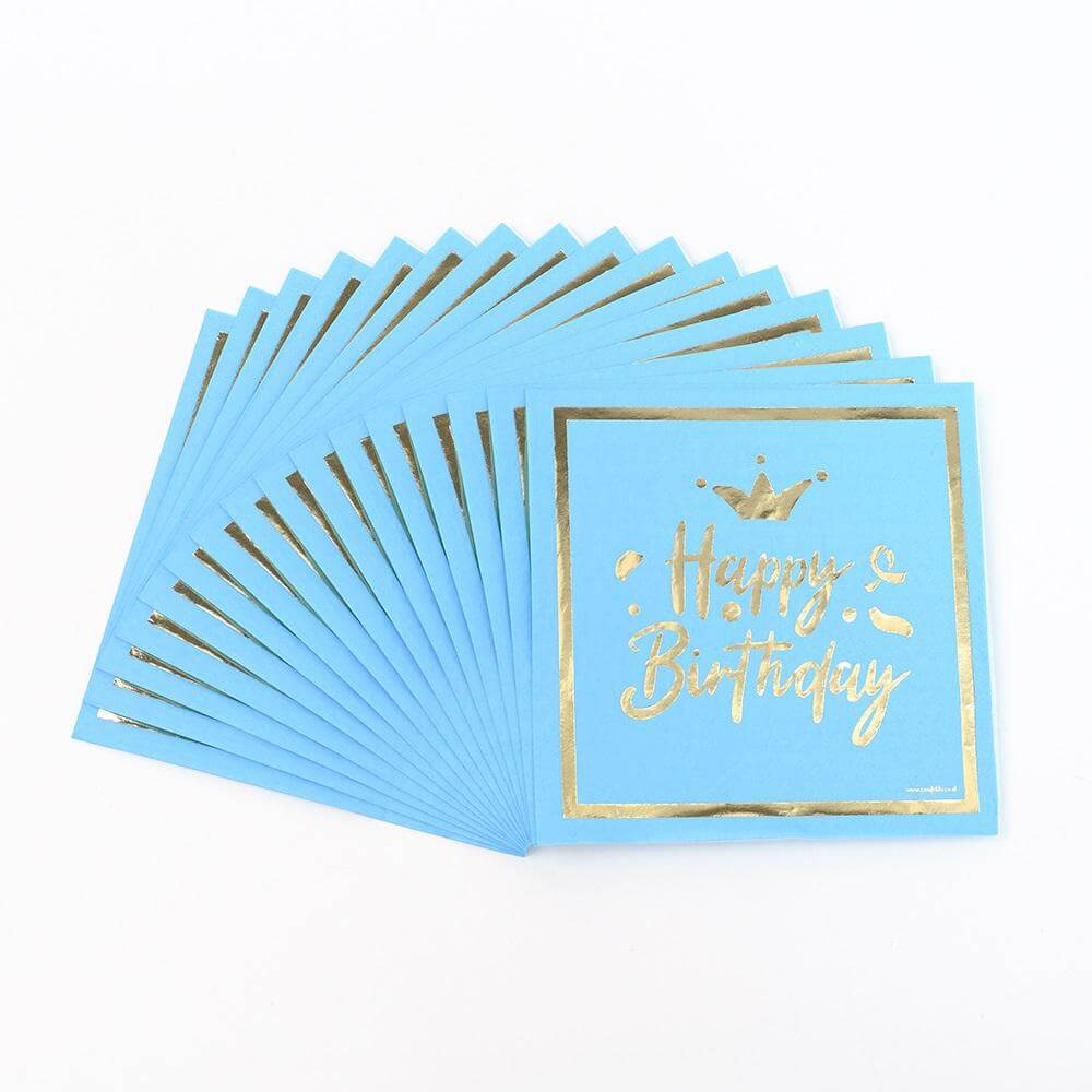 מפיות גדולות בצבע כחול עם כיתוב happy birthday בזהב. הוספה מרהיבה לשולחן ליום ההולדת. עמידות ואיכותיות, עיצוב מודרני לאווירה חגיגית ושמחה.