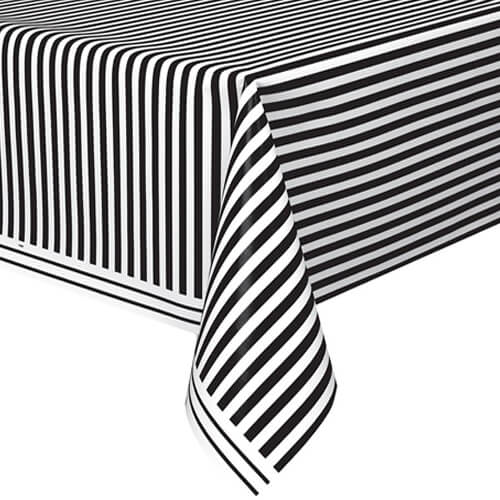 מפת שולחן חד פעמית, עשויה פלסטיק, בצבע לבן עם פסים שחורים. גודל: 137×274 ס”מ