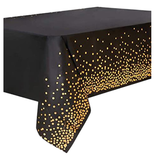 מפה חד פעמית איכותיות מפלסטיק, בעלת רקע שחור והדפס קונפטי זהב מטאלי בשוליים. גודל המפה: 137 * 274 ס”מ.