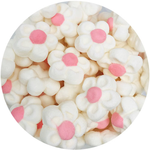 מרשמלו בצורת פרחים בצבע ורוד עם עלי כותרת בצבע לבן