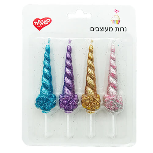 4 נרות צבעוניים מנצנצים בצורת קרן של חד קרן