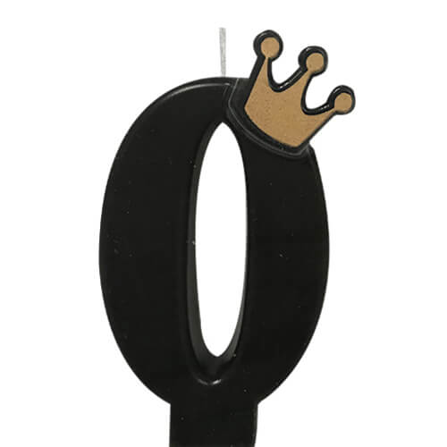 נר מספר 0, בצבע שחור עם כתר זהוב. מושלם לכל מסיבת יום הולדת . גובה הנר: 9 ס”מ.