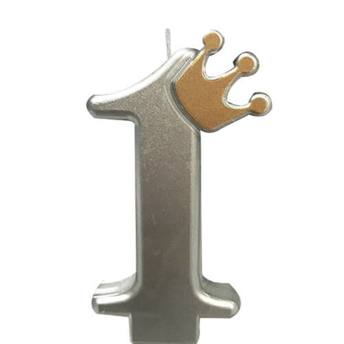 נר מספר 1, בצבע כסף עם כתר זהוב. מושלם לכל מסיבת יום הולדת . גובה הנר: 9 ס”מ.