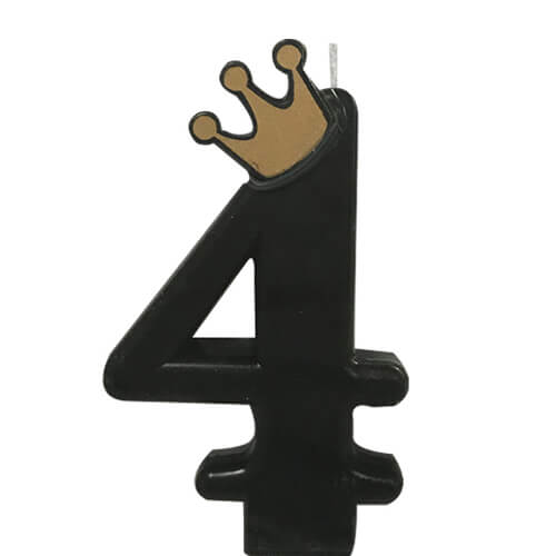 נר מספר 4, בצבע שחור עם כתר זהוב. מושלם לכל מסיבת יום הולדת . גובה הנר: 9 ס”מ.