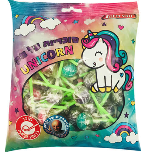 סוכריות על מקל בצבעי חד קרן בטעמי פירות