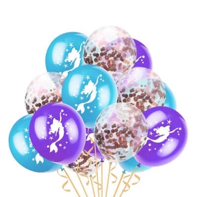 5 בלוני טורקיז בת הים 5 בלונים סגולים בת הים 5 בלונים שקופים עם קונפטי ורוד פוקסיה