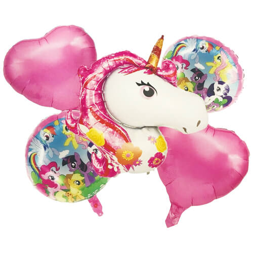 1 בלון חד קרן צבעוני 2 בלוני פוני ורוד 2 בלוני לבבות ורודים