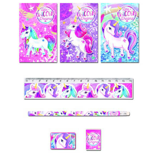 סט מכשירי כתיבה בקונספט חד קרן, מושלם כהפתעה במסיבת יום הולדת, או כמתנה חזרה לבית הספר הסט כולל: מחברת קטנה בגודל: 9.3×5.5 ס”מ סרגל בגודל: 1×15 ס”מ עיפרון, מחדד ומחק המחברת מגיעה במגוון עיצובים, הבחירה אקראית