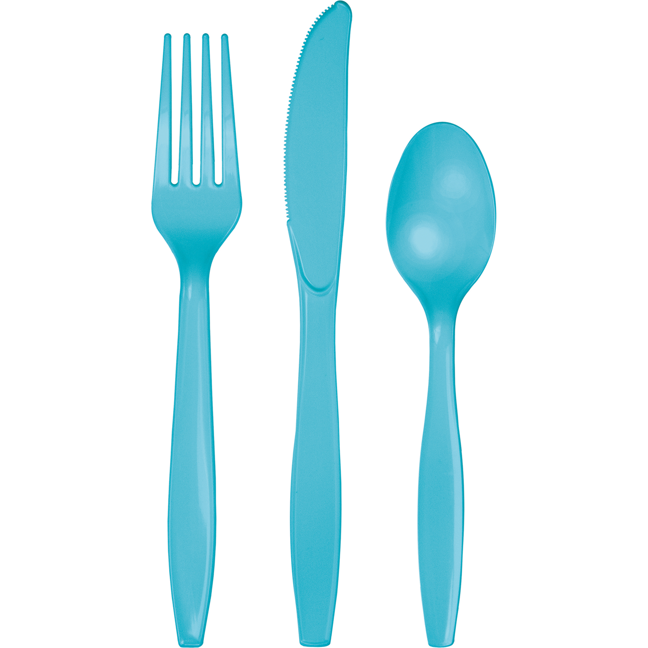 הסט מכיל: 8 מזלגות, 8 סכינים, 8 כפות. מי החליט שסכו”ם חייב להיות משעמם? אם כבר סכו”ם חד פעמי, לכו על צבע שיפיח לכם חיים על השולחן ויגרום לאוכל לרקוד בהתלהבות. סכו”ם פלסטיק בצבע טורקיז – למארגן המסיבה שלא מפחד להעיז!