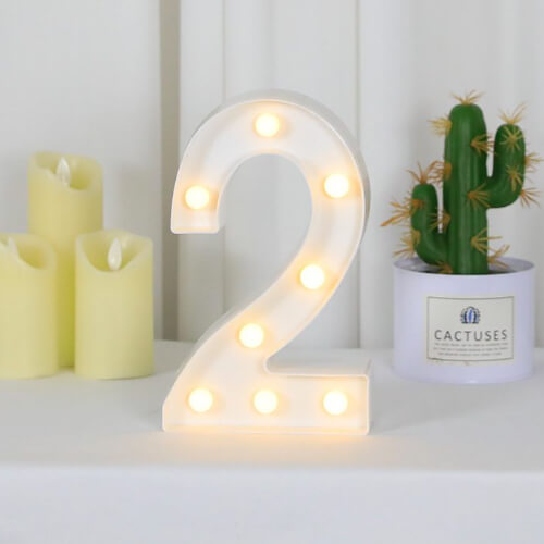 ספרה 2 בצבע לבן עם אורות לד לעיצוב חדר או אירוע