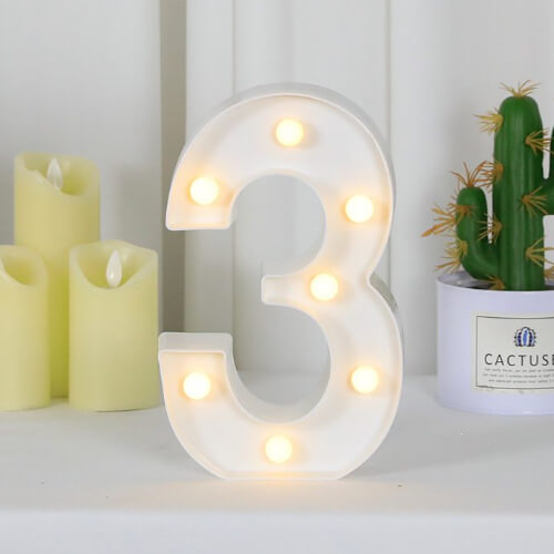 ספרה 3 בצבע לבן עם אורות לד לעיצוב חדר או אירוע