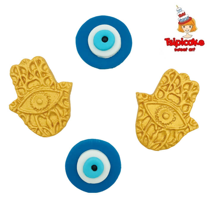 עין יוונית עם חמסה בצבע זהב מצבק סוכר לקישוט עוגה גודל העין: 4 ס”מ גודל החמסה: 6×5 ס”מ