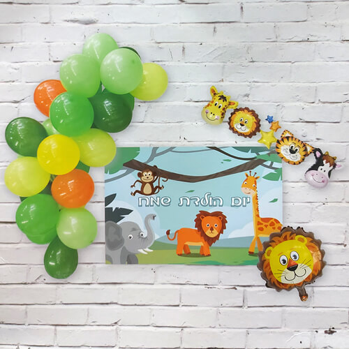 פוסטר 100X75 ס”מ בלון אריה 80 ס”מ גרילנדת בלוני חיות 24 בלוני גומי בצבעים: ירוק כהה,ירוק בהיר, מנטה, צהוב וכתום גליל סרט לגרילנדת בלונים סרט לבן לבלונים 40 מדבקות דו צדדי