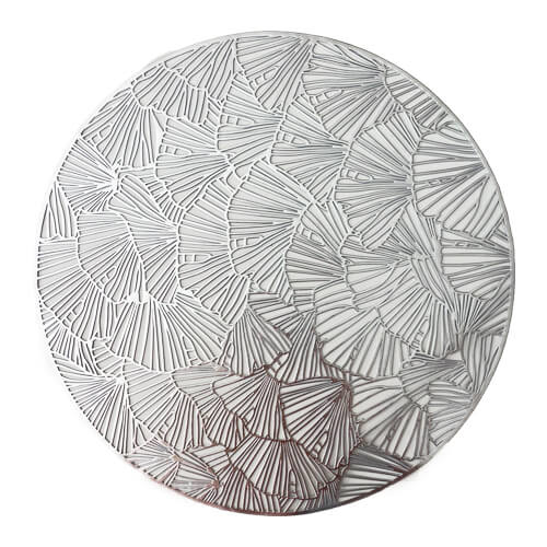 פלייסמנט בעיטור מניפות מרהיב בצבע כסף, מושלם לעיצוב שולחן אירוח ו/או חג. קוטר: 38 ס”מ