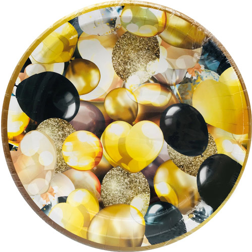 צלחות גדולות בקונספט בלונים בצבעי שחור וזהב