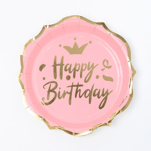 8 צלחות בצבע ורוד עם כיתוב זהב מושלמות לכל מסיבה.