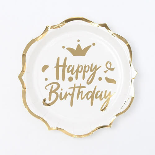 8 צלחות בצבע לבן זהב עם כיתוב Happy Birthday מושלמות לכל מסיבה.