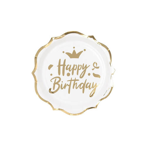 8 צלחות קטנות בצבע לבן זהב עם כיתוב Happy Birthday מושלמות לכל מסיבה.
