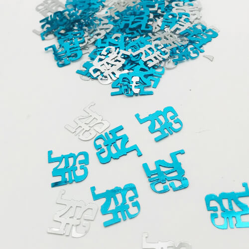 קונפטי מעוצב מזל טוב בצבע תכלת וכסף לקישוט שולחן בר מצווה.