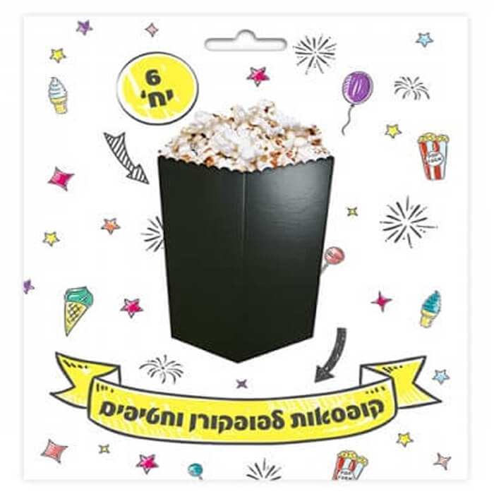 קופסאות פופקורן בצבע – שחור, מושלמות להגשת פופקורן, חטיפים וממתקים. גודל הקופסאות: 14 * 8.5 ס”מ. 6 קופסאות במארז.