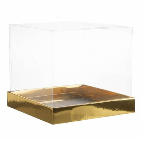 קופסת קרטון מרובעת גבוהה עם תחתית דגם זהב מטאלי + מכסה שקוף העשוי מPVC