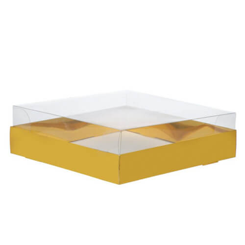 קופסת קרטון מרובעת עם תחתית דגם זהב מטאלי + מכסה שקוף העשוי מ PVC