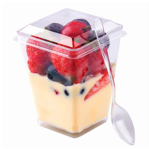 גביעי קינוח בקונספט ואזה, עשויים מפלסטיק ומתאימים להגשת מוסים מגיע עם מכסה שיכול לשמש גם כרגל לקינוחית.